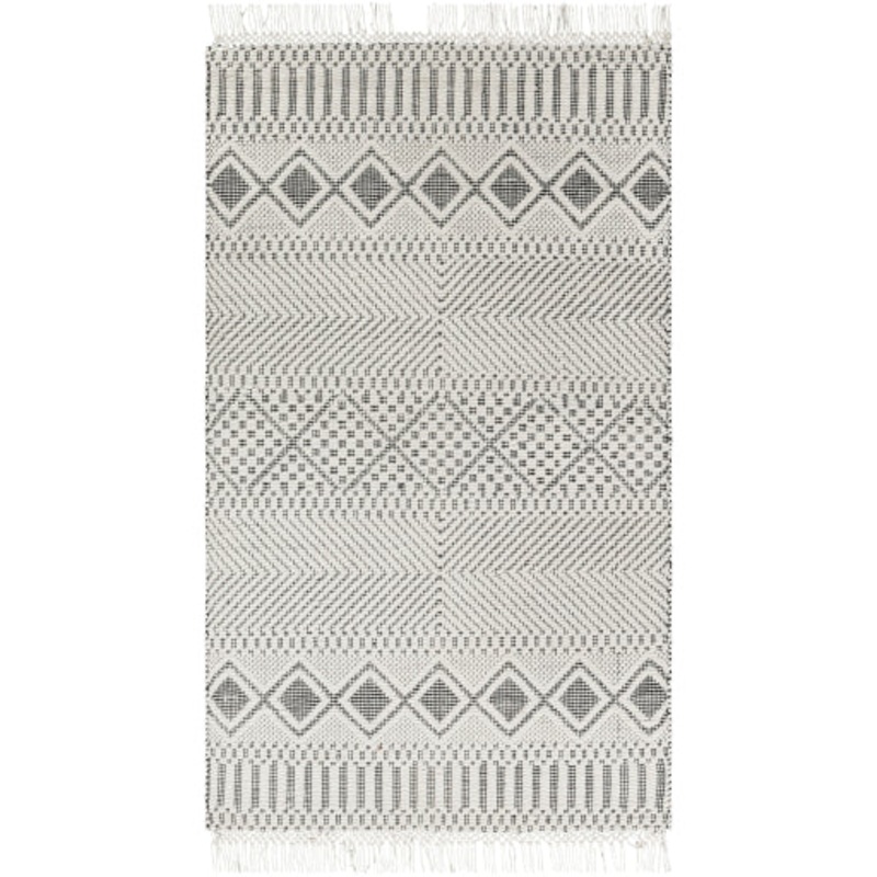 100% NZ WoolHand WovenNo PileThickness: 1"High/LowFringe Length: 5"Colors: Black, CreamTPX: 19-4004, 11-4300Made in India