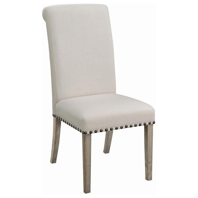 Appreciate the sophisticated look of a tall silhouette with fresh, inspiring style. This dining chair offers a versatile look that blends well with glass, wood, or metal tables. Transitional in motif, it combines invigorating modern touches with classic elements. A neutral upholstered wrap generates light, airy ambiance. Charming nail heads line the bottom of its seat edge, and narrow tapered legs with a neutral finish balance a stylish palette.