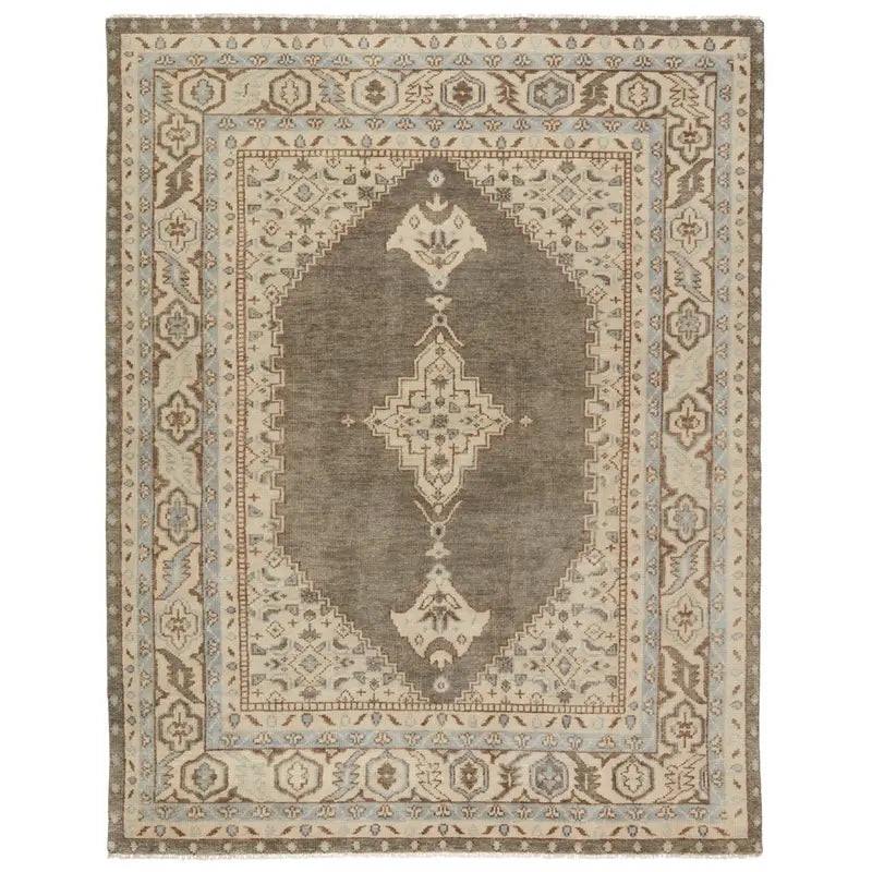 The Salinas collection blends timeless craftsmanship with understated elegance. Each piece features intricate, hand-knotted wool in a soft, inviting texture, designed to bring warmth to any space. The Farwell rug, with its soothing neutral palette, showcases a striking geometric medallion framed by delicate floral motifs offering both balance and refined charm. Artisan-made for lasting beauty, it introduces a whisper of sky blue, adding a serene touch to its versatile design.