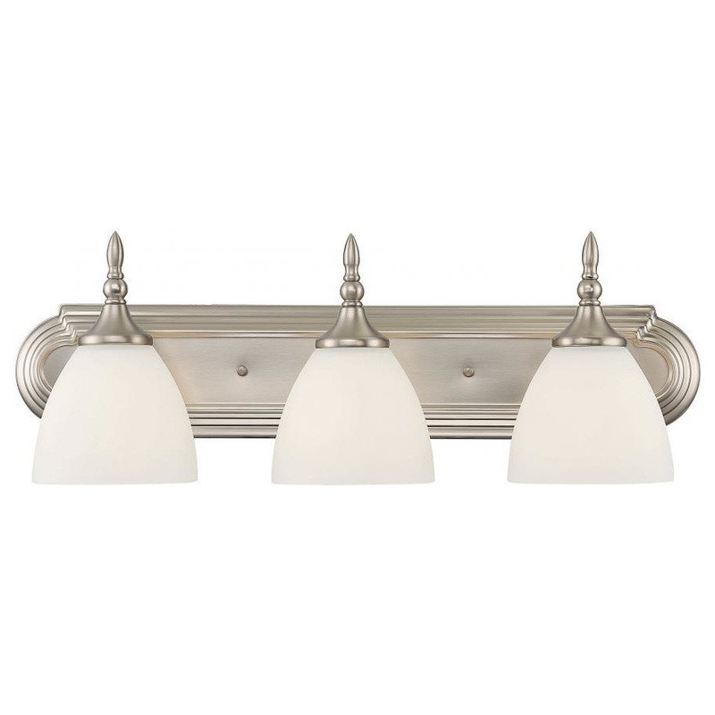 Three Light Bath from Herndon collection in Satin Nickel finish. Number of Bulbs 3. Max Wattage 100.00 . No bulbs included. The classic Herndon collection from has simple, elegant transitional style and offers many different fixture choices in English bron