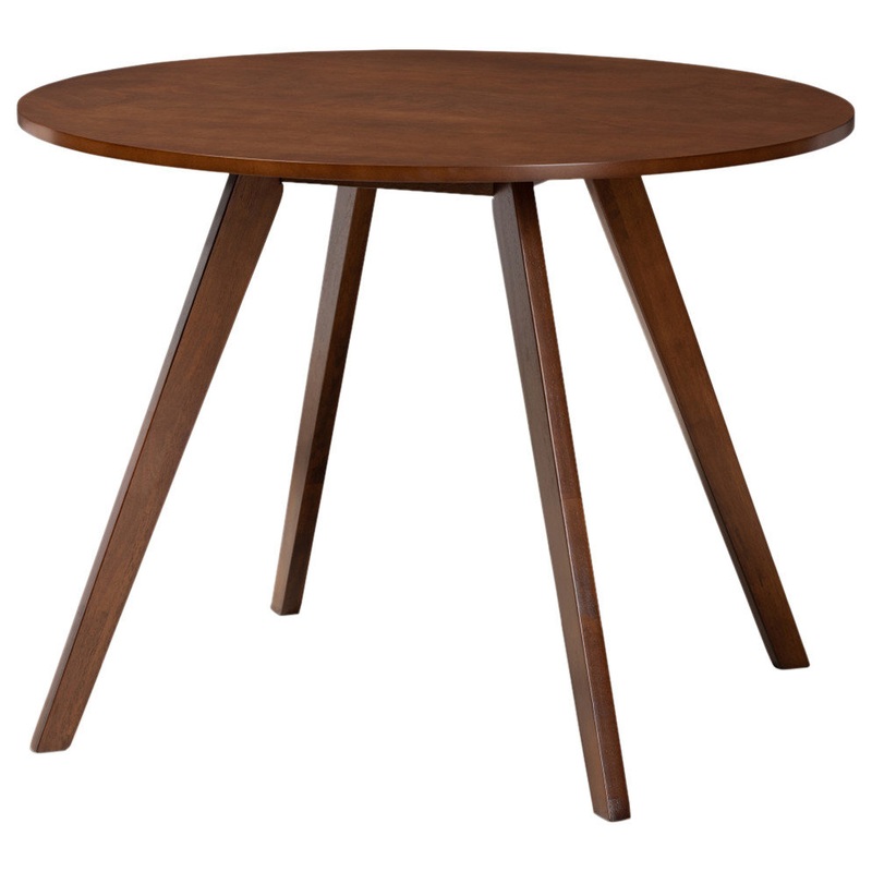 Modest and efficient design make the Scarborough dining table a refined addition to any space. Made in Malaysia, the Scarborough is constructed from durable rubberwood and comfortably sits up to four. A round tabletop finished in a striking walnut brown gives the Scarborough a mid-century charm while providing ample elbow room to each member of the table. The Scarborough requires assembly and is supported by splayed legs that add retro appeal. Featuring a compact size, the Scarborough dining table is well suited for areas with limited space.