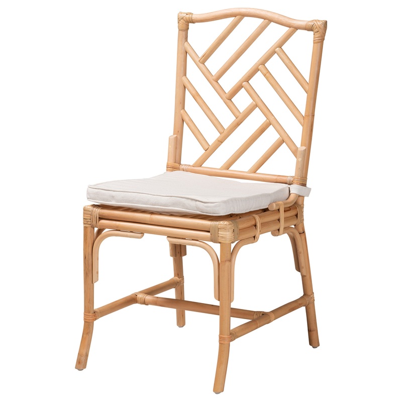 Rejuvenate the mood of every meal with the exotic flair of the Scarlet dining chair. Made in Indonesia, this bohemian inspired piece is crafted from natural rattan and features a plush fabric-upholstered seat cushion. Its openwork backrest features intersecting rattan rods for a sleek, geometric display that offers superb back support. The Scarlet will arrive fully assembled and features an ergonomic crossbar between its legs for excellent stability and support. Granting a tranquil aura to every occasion, the Scarlet dining chair refreshes any interior.