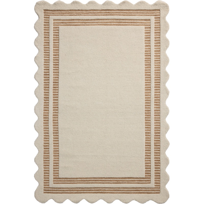 The Scottie Collection from Chris Loves Julia x Loloi is a hand-tufted wool area rug with a playful scalloped edge and lower-pile, striped border for a touch of structure. The rugs overall pile is thick and plush, available in easygoing earth tones and neutral colorways. This collection is hand-tufted of 100% wool in India and GoodWeave-certified, ensuring our commitment to ethical production and the support of weavers communities. Some shedding is expected and a natural characteristic of wool rugs; we recommend vacuuming frequently without a beater bar.