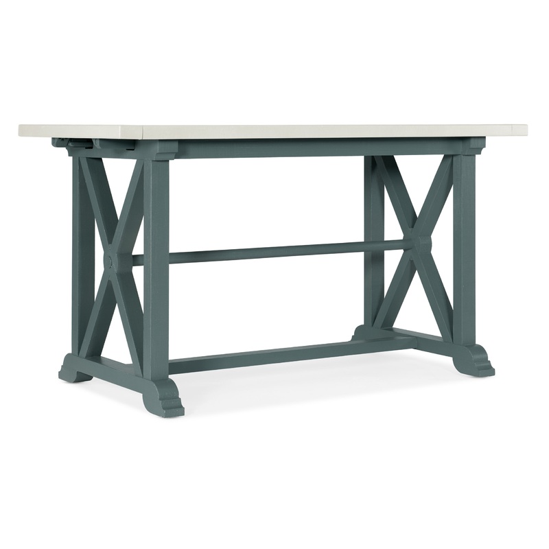 Capture the calming palettes and organic textures of cottage waterfront living with the chic classic counter height Piers Friendship Table. Crafted of Oak Veneers with a Solid-Wood Edge top, the table has an x-motif base and stretcher. If the two 12-inch leaves are used, the table extends to 88 inches long and accommodates 6 counter stools. Without the leaves, it accommodates 4 counter stools.
