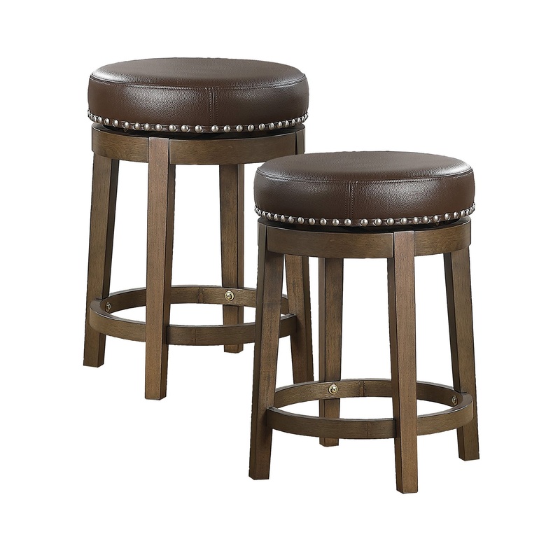 -Kiln dried rubber-wood frame -Solid-hue faux leather upholstery -Brown finished stool base frame -Foam padded round seat cushion -Stain nickle finished nailhead trim -Seat with 360-degree swivel motion -Base with footrest for added comfort -Overall Dimens