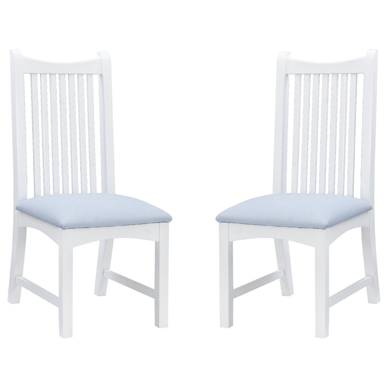 -Sold in a set of 2 -Great as an additional seating option for guests -Made from solid beechwood in a crisp white color -Classic slatted back design and an easy to clean light blue faux leather upholstered seat -The seat height of 18" -Assembled Dimensions