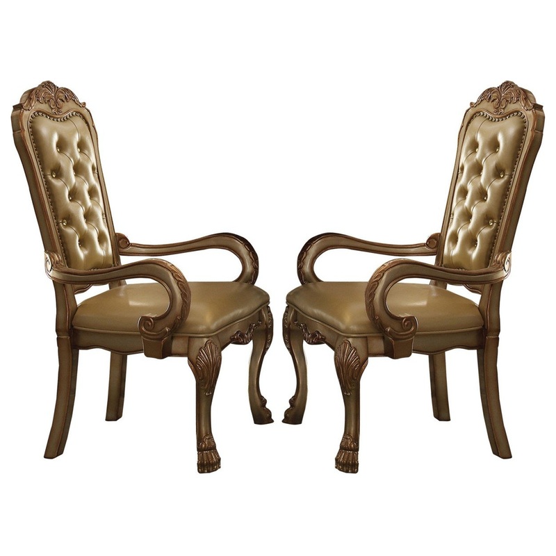 -Set contains two 24 inch wide side chairs -Ultra comfortable padded seating -Button tufted backrest -Solid aspen wood frame -Polyresin accented crowned top claw legs Nailhead trim details -Vegan leather upholstery -Comfortable seating for your dining area