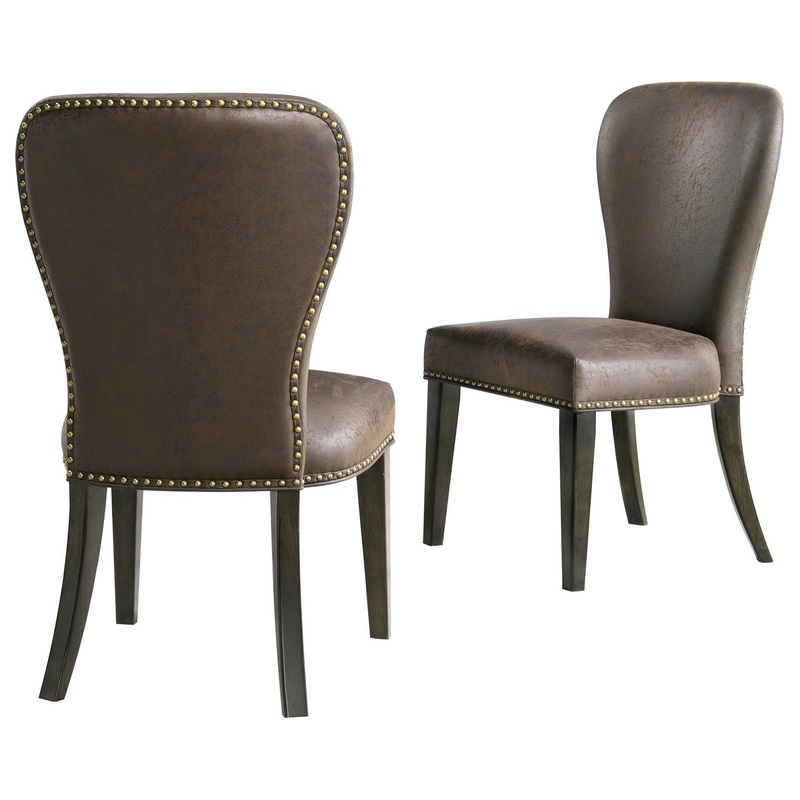 -These timeless chairs are sure to bring style and flare to your dining room table. -The chairs are upholstered in a premium, distressed faux leather material with nailhead trim which adds to the sophisticated detailing of this classic dining chair. -The d
