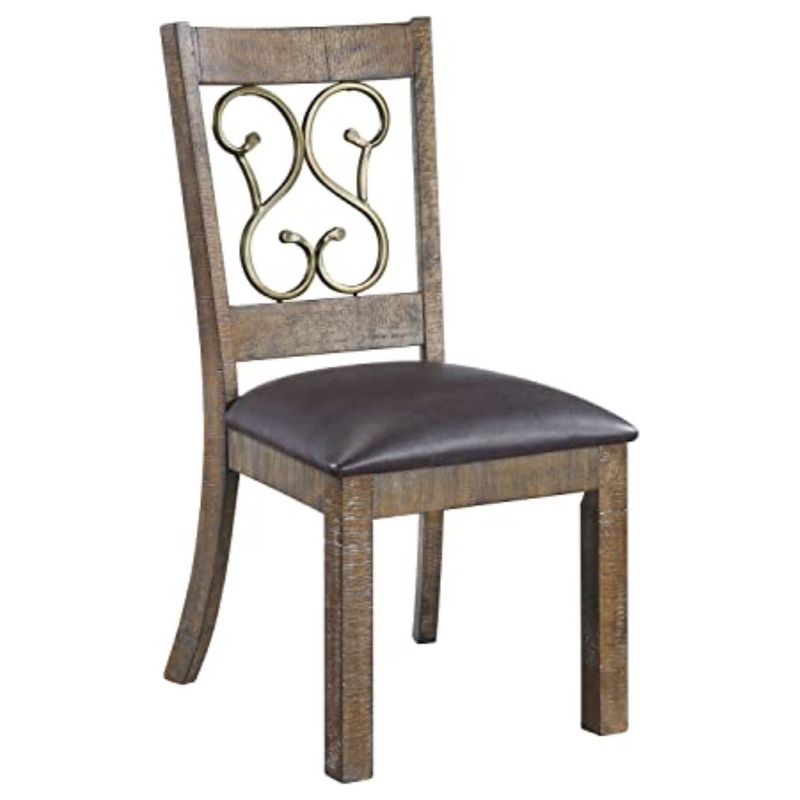 -Black, Weathered Cherry Chair, 19" W x 22" D x 38" H -Open scroll seat back , Decorative roughhewn details -Black faux leather seat with a weathered cherry wood finish -Arrives as a set of two chairs -Cushion thickness: 3-inchProduct ID198301828Manufactur