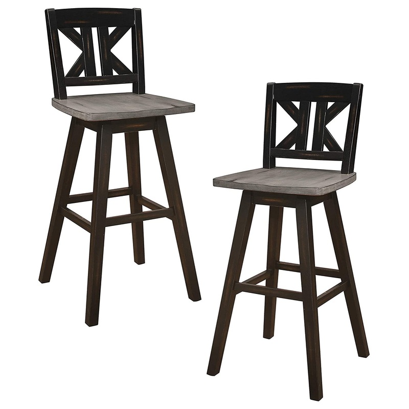 -A pair of barstools -Distressed black finished K-back -Distressed gray finished seat top -360-degree gentle swivel motion -Ships in (1) box and requires assemblyProduct ID185492605Manufactured ByDecornSold ByDecornSize/WeightW 18" / D 18" / H 37.5" / 44 l
