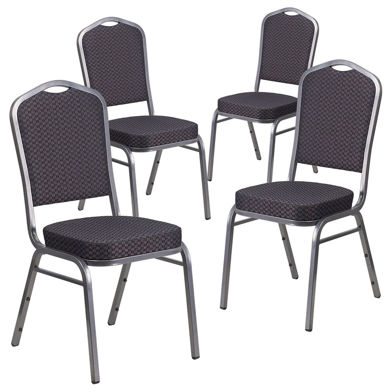 -Set of 4 Multipurpose Crown Back Banquet Chairs for All Occasions -500 lb. Weight Capacity -Stack Quantity: 15 -2.5" Thick Seat Cushion with CAL 117 Fire Retardant Foam -16 Gauge Steel Frame with bumper guards to protect finish while stacked -Floor Protec