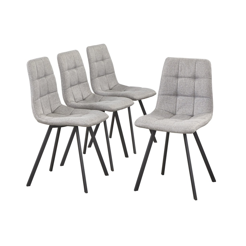 -Set includes: four (4) chairs -Mid-Century inspired style -Tufted upholstered dining chairs -Black stylishly angled metal legs -Chairs constructed of bentwood, fabric, and foam and metal -Upholstered in a Gray Linen-like fabric -Seamless styled chair seat