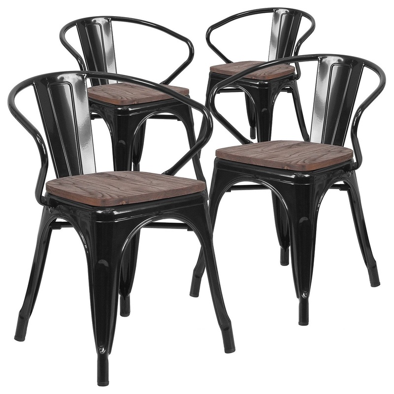 -Set of 4 Stackable Bistro Style Chairs -500 lb. Weight Capacity -Stack Quantity: 8 -Curved Back with Vertical Slat -Integrated Arms -Textured Walnut Elm Wood Seat -Black Powder Coat Finish -Galvanized Steel Construction -Cross Brace under seat provides ex