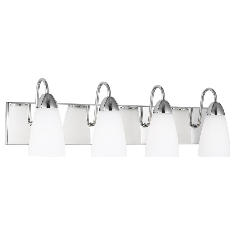 The Generation Lighting Lighting Seville four light vanity fixture in chrome provides abundant light for your bath vanity, while adding a layer of today’s style to your interior design. The Seville collection represents commitment to high style at a sharp price. The modernist design is epitomized by the teardrop curves in the arms tipped by etched glass diffusors throughout the chandeliers and bath fixtures. The collection offers a “whole home” lighting solution in every imaginable category. The assortment includes nine-light, five-light, and three-light chandeliers (either with up-light or down-light), pendants in four sizes as well as one-light, two-light, three-light, four-light and five-light wall/bath fixtures. Install a stylish and elegant addition to any room in the house. Seville is offered in Brushed Nickel and Burnt Sienna finishes.