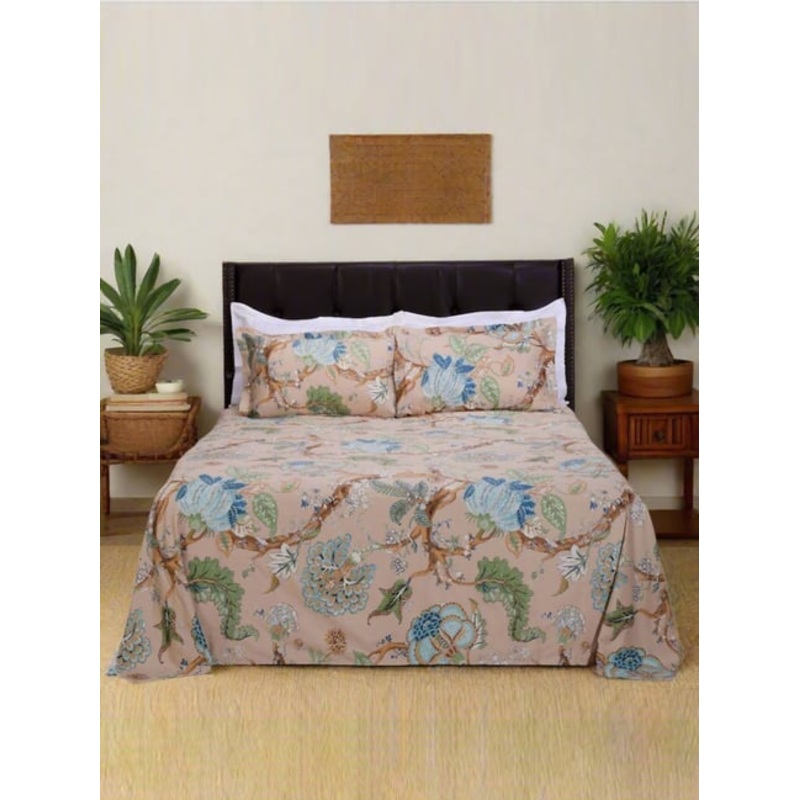Wrap yourself in dreams with this set of 1 magnolia vine luxury double bedsheet and 2 pillow covers from Shahenaz. The luxuriously soft and breathable cotton fabric of 300 TC with a satin weave ensures a comfortable sleep, while the rich colors and captiva