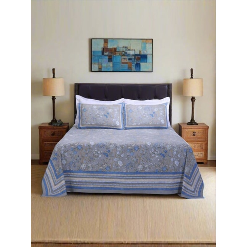 Shahenaz Blue & Grey 120 TC Cotton Rama Kashvi Single Bedsheet with 1 Pillow Cover