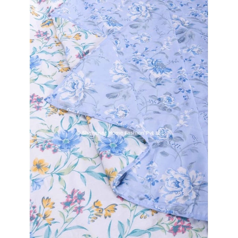Unwind in Serene Blooms: Blue Floral Dohar. Drift away in a sea of tranquility with the Blue Floral Dohar. Crafted from 100 percent breathable cotton muslin, this luxuriously soft dohar features a captivating floral design in a calming shade of blue. Double the Serenity, Reversible Design: One side showcases the enchanting blue floral design, creating a peaceful ambiance in your bedroom. Flip the dohar to reveal the same design on a crisp white base, offering a serene and airy aesthetic.