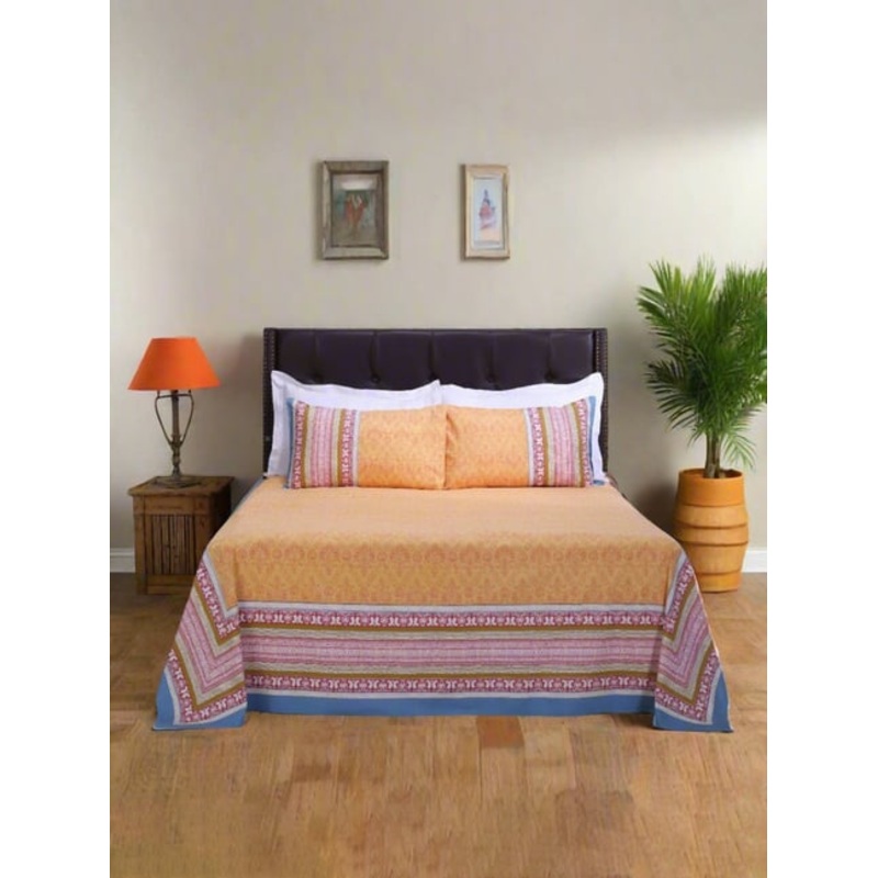 Drift into a sea of comfort with this set of 1 madhuban paisley single bedsheet and 2 pillow covers from Shahenaz. It is crafted to perfection using cotton with a cotton weave of 120 TC. Beyond the captivating beauty, the luxuriously soft fabric ensures a cool and comfortable sleep. The included pillow covers complete the set, offering a touch of coordinated elegance to your sleep haven.