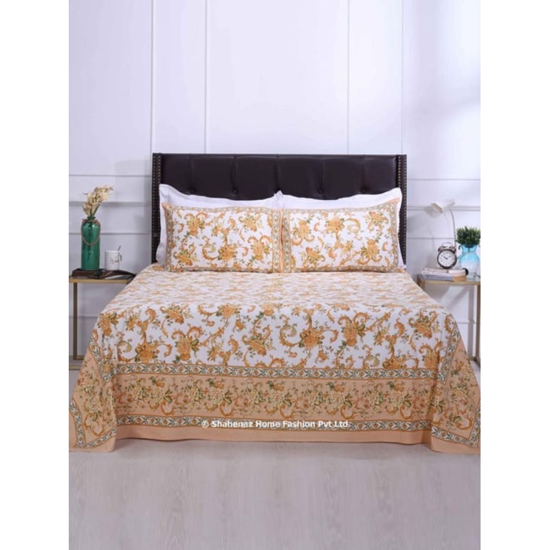 Drift into a sea of comfort with this set of 1 rama Victoria jaal double bedsheet and 2 pillow covers from Shahenaz. The luxuriously soft and breathable cotton fabric of 120 TC with a plain weave ensures a comfortable sleep, while the rich colors and capti