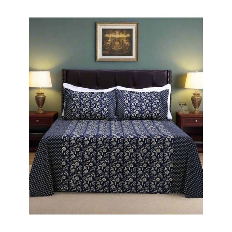 Indulge in the embrace of this cozy and stylish set of 1 rahat double bedsheet and 2 pillow covers from Shahenaz. The luxuriously soft and breathable cotton fabric of 120 TC with a plain weave ensures a comfortable sleep, while the rich colors and captivat