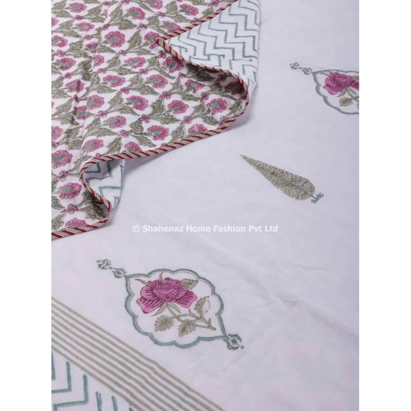 Embrace Timeless Elegance: Olender Jaal Green Dohar. Unwind in the luxurious comfort of the Olender Jaal Green Dohar, handcrafted from 100 percent breathable cotton muslin. This reversible dohar features a captivating Jaal design, hand-block printed for an artisanal touch, in a calming shade of green. Double the Charm, Reversible Design: One side showcases the mesmerizing Jaal pattern, adding a touch of sophistication and timeless elegance to your bedroom. Flip the dohar to reveal a delightful pattern of smaller flowers, offering a charming and versatile look.