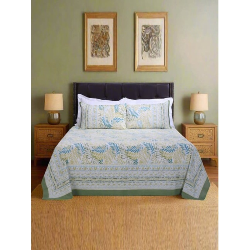 Transform your bed into a sanctuary of serenity with this exquisite set of 1 French leaves double bedsheet and 2 pillow covers from Shahenaz. The luxuriously soft and breathable cotton fabric of 120 TC with a plain weave ensures a comfortable sleep, while