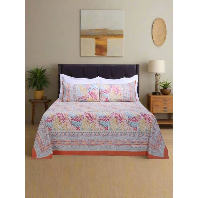 Make bedtime your favorite time with this irresistibly soft set of 1 French leaves double bedsheet and 2 pillow covers from Shahenaz. The luxuriously soft and breathable cotton fabric of 120 TC with a plain weave ensures a comfortable sleep, while the rich colors and captivating designs transform your bedroom into a tranquil oasis. This set adds a touch of sophistication to your slumber sanctuary.