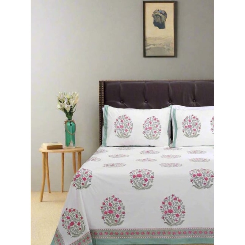 Shahenaz Pink & Green 220 TC Cotton Bagh-E-Kainaat Double Bedsheet with 2 Pillow Covers