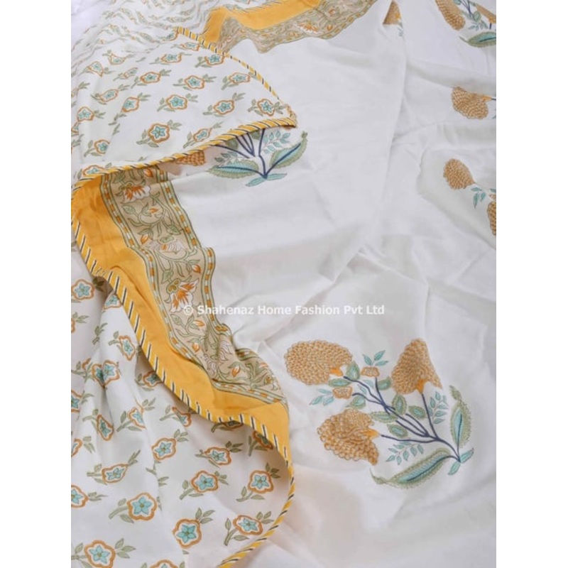 Vintage Marigold Dohar. Embrace the warmth and vibrancy of summer with the Vintage Marigold Dohar. Crafted from 100 percent breathable cotton muslin, this lightweight coverlet features a captivating hand-block printed design in a cheerful shade of marigold