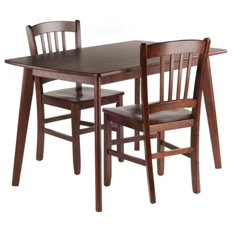 Style and integrity of construction define this 3-Piece Shaye Dining Table Set. The table’s solid, tapered legs have a distinctive notch where they meet the frame that give it a unique, contemporary look. And the tabletop has a softly curved profile that adds refinement to the design. The set includes two Slat Back Chairs that have comfortable contoured seats and graceful rainbow arches that add a sweet touch to the traditional ladderback design. Both the table and chairs are made of Solid Wood for durability, and the Walnut finish brings out the warmth of the natural wood grain.