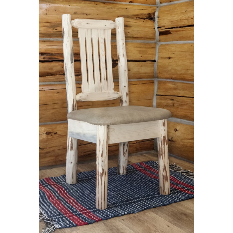 This wonderful dining/side chair is as comfortable as it is unique. Handcrafted using small diameter lodge pole logs harvested in Montana this log dining chair is designed to last for generations. This chair incorporates the tried and true mortise and tenon joinery system that has served as a symbol of durability for millennia. Seat height is 18″. Seat width is 18.5″. Seat depth is 17″. Capacity 350 pounds. This model features the comfy upholstered seat in the buckskin pattern. Comes fully assembled. This item is sold “ready to finish” i.e., it is ready for the purchaser to paint, stain or stain and lacquer. 20-year limited warranty included at no additional charge. Hand crafted in Montana U.S.A.!