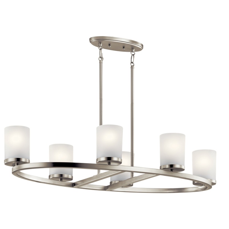Specifications for this Kichler Six Light ChandelierSimple lines and softly etched glass shades bring transitional style to the Daimlen 6 light oval chandelier in Brushed Nickel.Width: 20.25"Height: 13.50"Length: 39.25"Weight: 18.00 lbChain: 36"Wire: 156"C