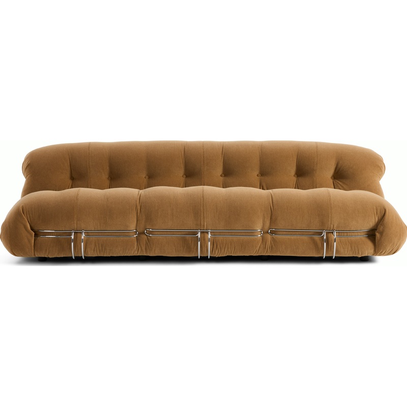 Italian husband-and-wife team Afra and Tobia Scarpa created the Soriana Sofa in 1969, and its distinctive silhouette shaped design history. Their ingenious use of polyurethane foam created a padded, pillowy, cloud-like cushion anchored firmly to the ground by a sculptural steel brace. Theres a freedom in Sorianas shape generous contours invite uninhibited relaxation. Choose from two or three seats in fabrics and finishes that complement the sofas free-flowing form. The Scarpas iconic design continues to revolutionize. Its internal padding is made from biodegradable BioFoam and 100% PET-blown fiber from Plastic Bank, an eco-social initiative that aims to stop plastic pollution. Made in Italy.