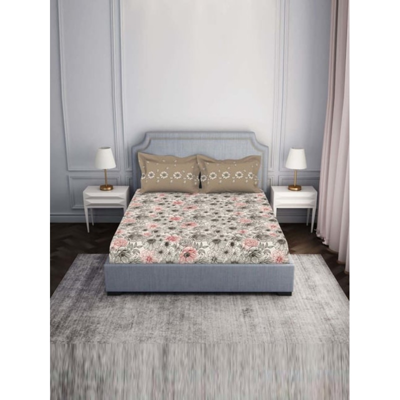 Spaces Atrium Cream & Pink 100% Cotton 144 TC Double Bedsheet with 2 Pillow Covers