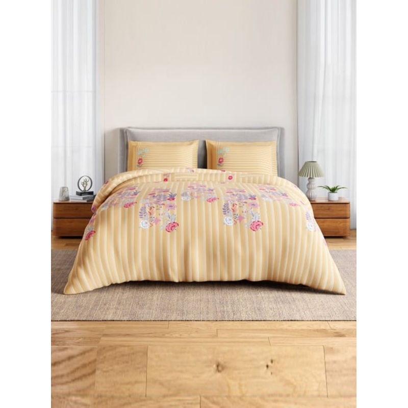 Gold red floral with SPACES Rangana Swarna Comforter in gold, vibrant flowers. Eco 100% cotton festive, safe for skin 224cm x 270cm double. Maintain: 40C wash, tumble dry low, do not bleach or dry clean, avoid iron."Ideal For ": " Home""Pattern ": " Floral