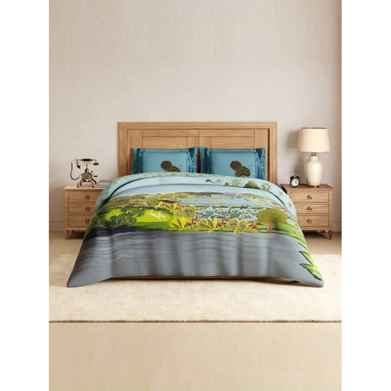Scenic beauty in SPACES Rangana Swarna Comforter in teal, landscape print with trees and flowers. Eco-friendly 100% cotton, rich festive look, safe for skin double 224cm x 270cm. Care instructions: normal 40C machine wash, low tumble dry, no bleach or iron