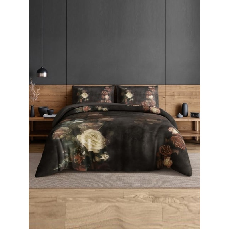 Mysterious allure in SPACES Elegance Noir 210 TC Bedsheet in black, dark floral for dramatic effect. Breathable super soft 100% cotton sateen, safe for skin 274cm x 274cm sheet. Upkeep: machine wash 40C, tumble dry low, no bleach or dry clean, warm iron op