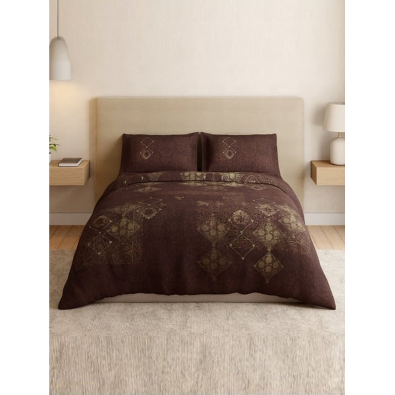 Indulge in richness with SPACES Essentials 180 TC Bedsheet in Chocolate Lab, featuring ornate Gilded Nouveau motifs in dark brown. Super soft, breathable 100% cotton safe for skin set has 274cm x 274cm sheet and two 43cm x 68cm pillow covers. Care: 40C normal wash, tumble dry low, avoid bleach and dry cleaning, warm iron if needed.