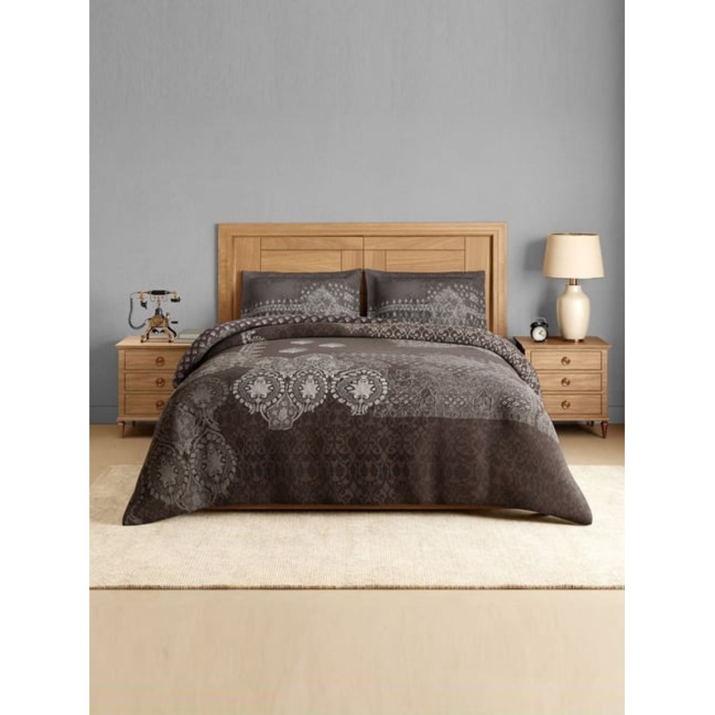 Opulent ornate with SPACES Rangana Swarna Comforter in dark brown, intricate patterns for festive luxury. Made with recycled water, 100% cotton rich and skin-safe double size 224cm x 270cm. Care: machine wash 40C, low tumble dry, do not bleach or dry clean