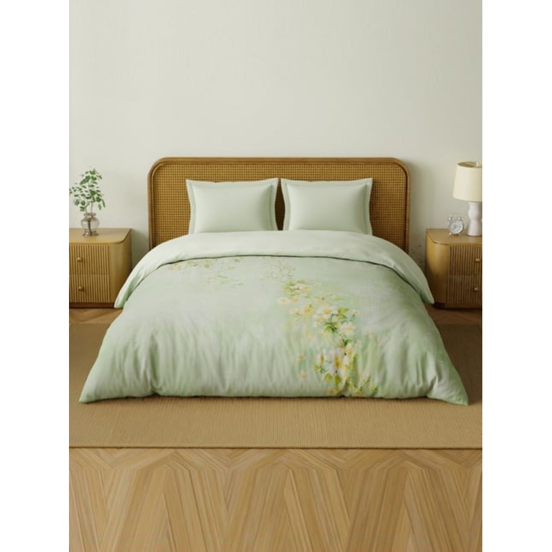 Fresh greenery in SPACES Organic Cotton 180 TC Quilt in Canary Green, floral design for nature-inspired comfort. Digital print on organic cotton, breathable and skin-safe double quilt 224cm x 270cm in light green. Upkeep: normal wash 40C, low tumble dry, d