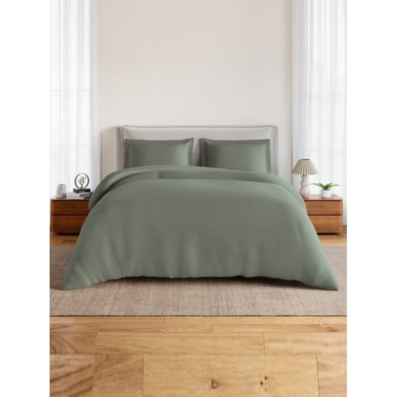 Revitalize with SPACES Essentials AW25 170 TC Bedsheet in Tea, solid green for a natural feel. 100% cotton construction ensures breathability, softness, skin safety fits 274cm x 274cm bed with two 43cm x 68cm pillow covers. Care: 40C normal wash, low tumbl