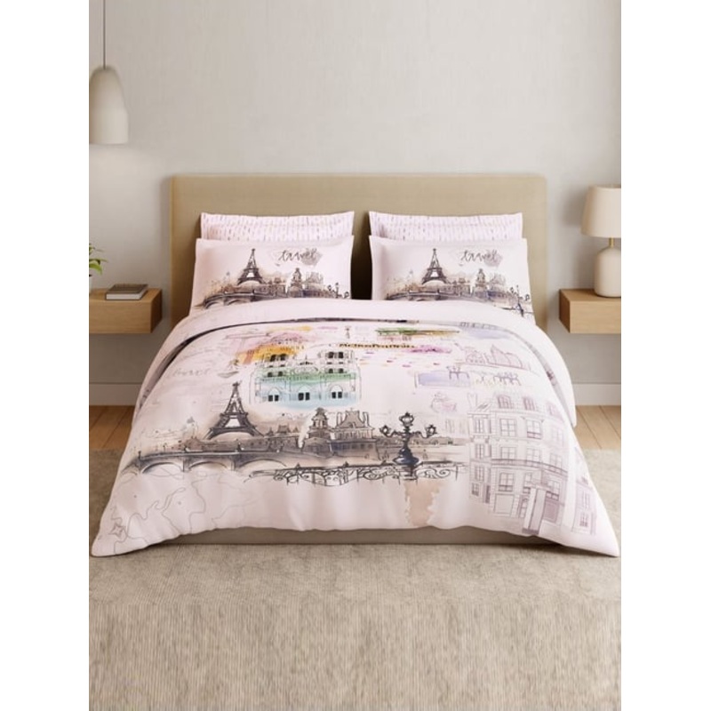 Delight in SPACES Essentials Premium 180 TC Bedsheet in Calcite, with abstract Voyager pattern in light pink hues. Super soft, breathable 100% cotton safe for skin includes large 274cm x 274cm sheet and four 43cm x 68cm pillow covers. Care: wash at 40C, tumble dry low, no bleach or dry clean, warm iron if needed.
