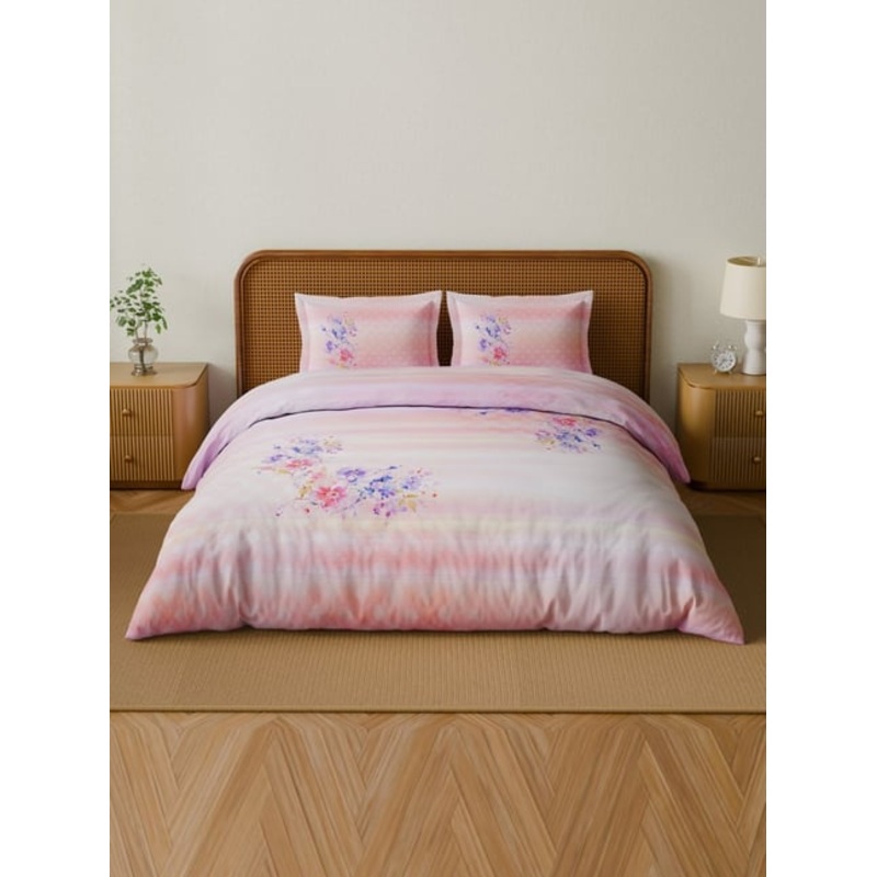 Soft pink tulle floral digital print, organic cotton percale. Breathable, skin safe, 180 TC, includes 274×274 cm bedsheet and 43×68 cm covers.