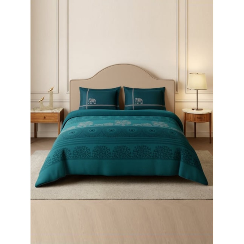 Celebrate tradition with SPACES Rangana Swarna 210 TC Bedsheet in Adriatic Blue, floral Swarna Madhubani print for festive vibes. Made with 100% recycled water, 100% cotton sateen that’s skin-safe and rich-looking 274cm x 274cm sheet with two 43cm x 68cm pillow covers in teal. Care: machine wash 40C, low tumble dry, no bleach or dry clean, warm iron as required.
