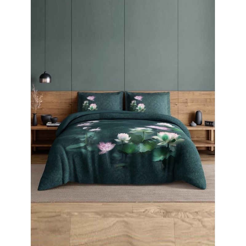 Serenity in SPACES Elegance Noir 210 TC Bedsheet in dark green, pink lotus design for tranquil rest. Super soft sateen 100% cotton, breathable and skin-safe 274cm x 274cm king sheet. Maintain: wash at 40C, tumble dry low, do not bleach or dry clean, warm i