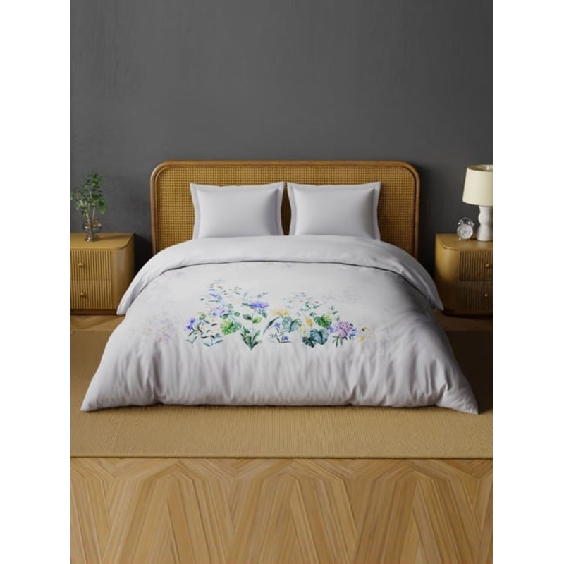 Soft florals in SPACES Organic Cotton 180 TC Quilt in Lilac Hint, light violet for calming rest. Organic cotton with digital print, breathable and skin-safe double quilt 224cm x 270cm. Care instructions: wash at 40C, low tumble dry, no bleach or iron, do not wring.