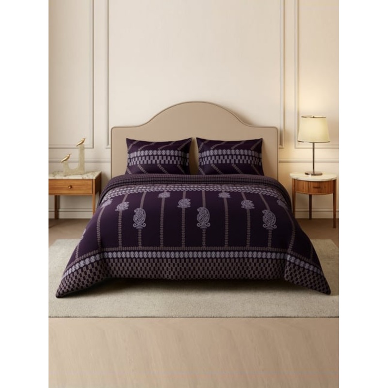 Opulent touch with SPACES Rangana Swarna 210 TC Bedsheet in Plum, ornate Swarna Chikankari pattern in dark violet. 100% cotton sateen using recycled water for rich, skin-safe comfort king 274cm x 274cm sheet with two 43cm x 68cm pillow covers. Easy care: 4