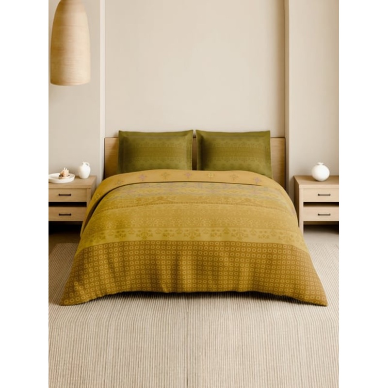 Crafted from 100% cotton sateen, printed with a geometric design for a vibrant look. Made with environmentally responsible recycled water. Set includes a 274×274 cm bedsheet and 43×68 cm pillow covers. Offers 210 TC thread count, ensuring softness and durability.