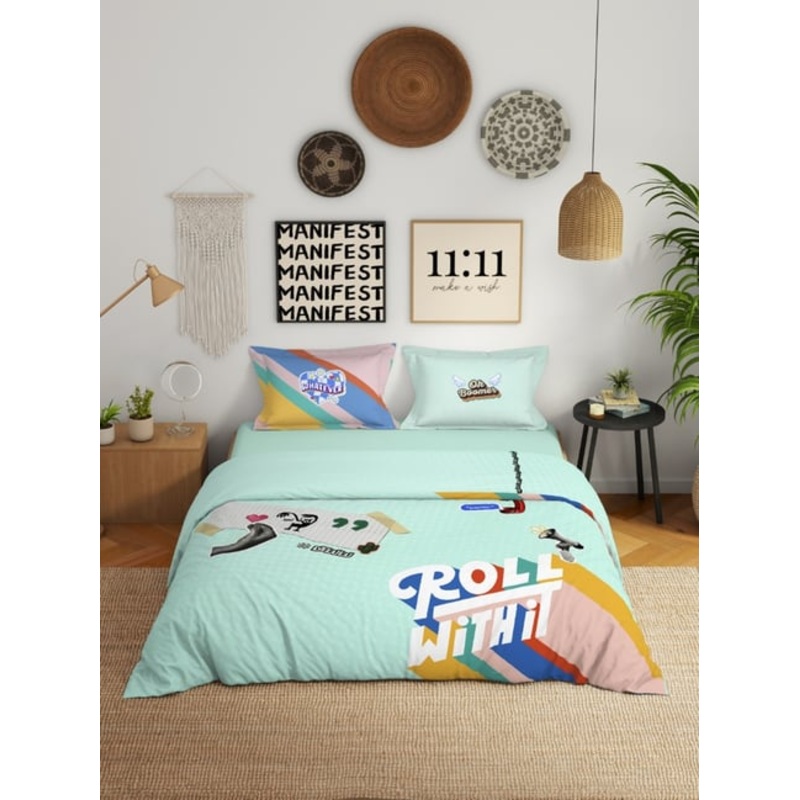 Spaces Genz Light Aqua Cotton Printed 180 TC Double Bedsheet with 2 Pillow Covers