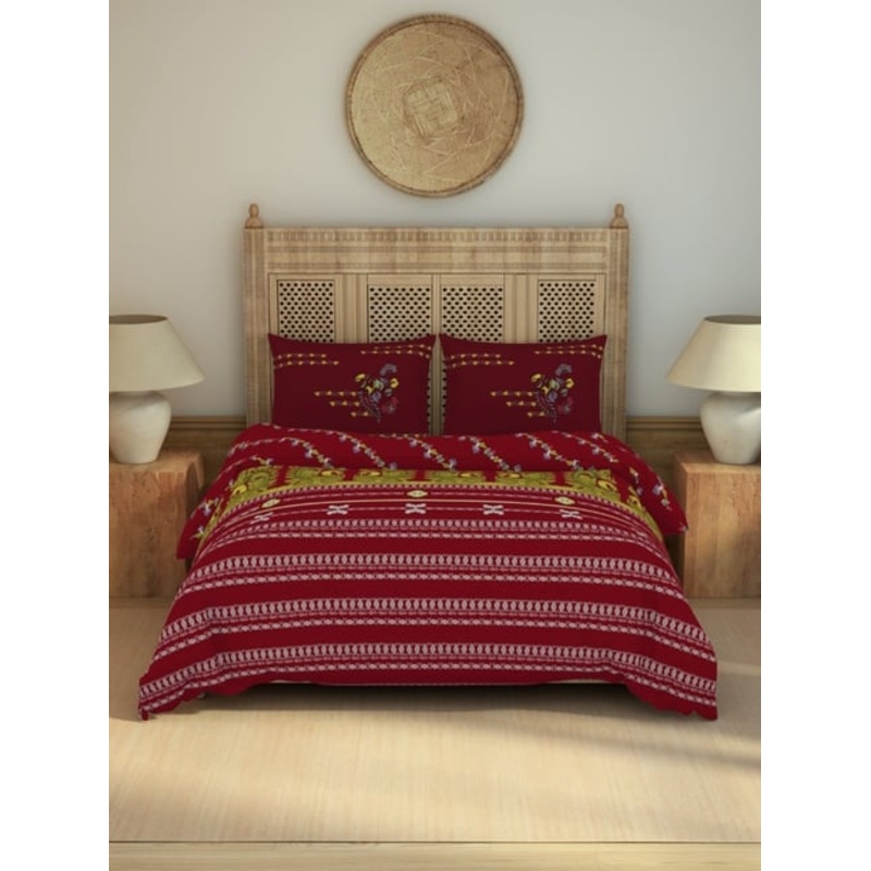 Transform your bedroom into a vibrant oasis with the Spaces madhubani red cotton printed double bedsheet. Crafted from premium 210 tc cotton, this luxurious set includes 2 pillow covers for a complete look. The intricate madhubani print adds an artistic fl